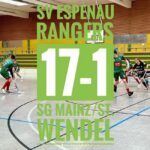 (ds) Die SV Espenau Rangers haben zum Abschluss der regulären Saison der Floorball-Regionalliga West/Hessen einen souveränen 17:1-Sieg über Schlusslicht SG Mainz/St. Wendel gefeiert. In einem recht einseitigen Spiel war der Anfang zwar zäh und schwierig gegen die kämpferisch starken Außenseiter, jedoch zeigte sich im Lauf des Spiels immer mehr, wer der Favorit war und auch quantitativ deutlich besser aufgestellt war.